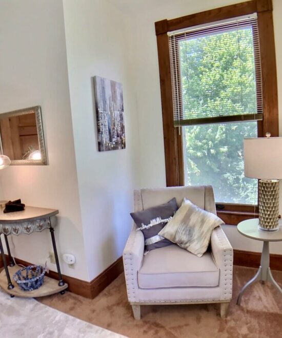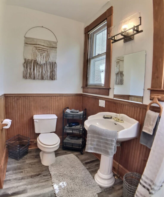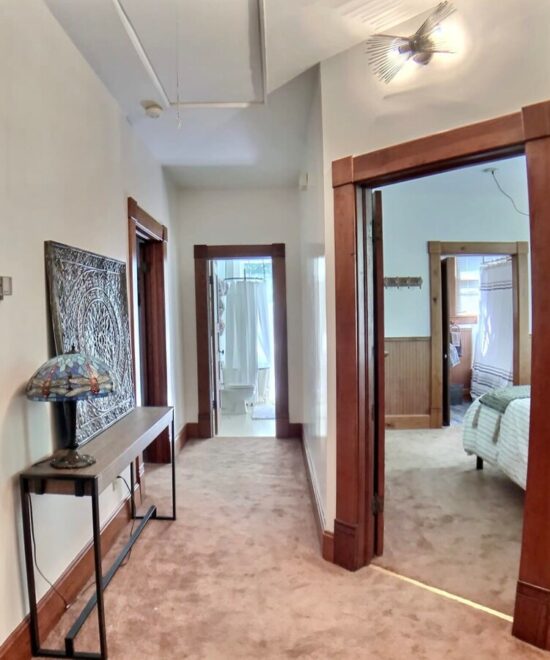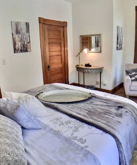 Ridgeway House B&B offer the two rooms, Pink Lady and the Up Town as a 2 Bedroom Suite. The bathroom is not ensuite, however it is only for your two rooms. The pink lady has a king bed and fireplace in the room. The up town room features a queen bed. Both rooms have access to upper front porch. A perfect place to relax after shopping, hiking, biking, or playing in one of our lakes or rivers.